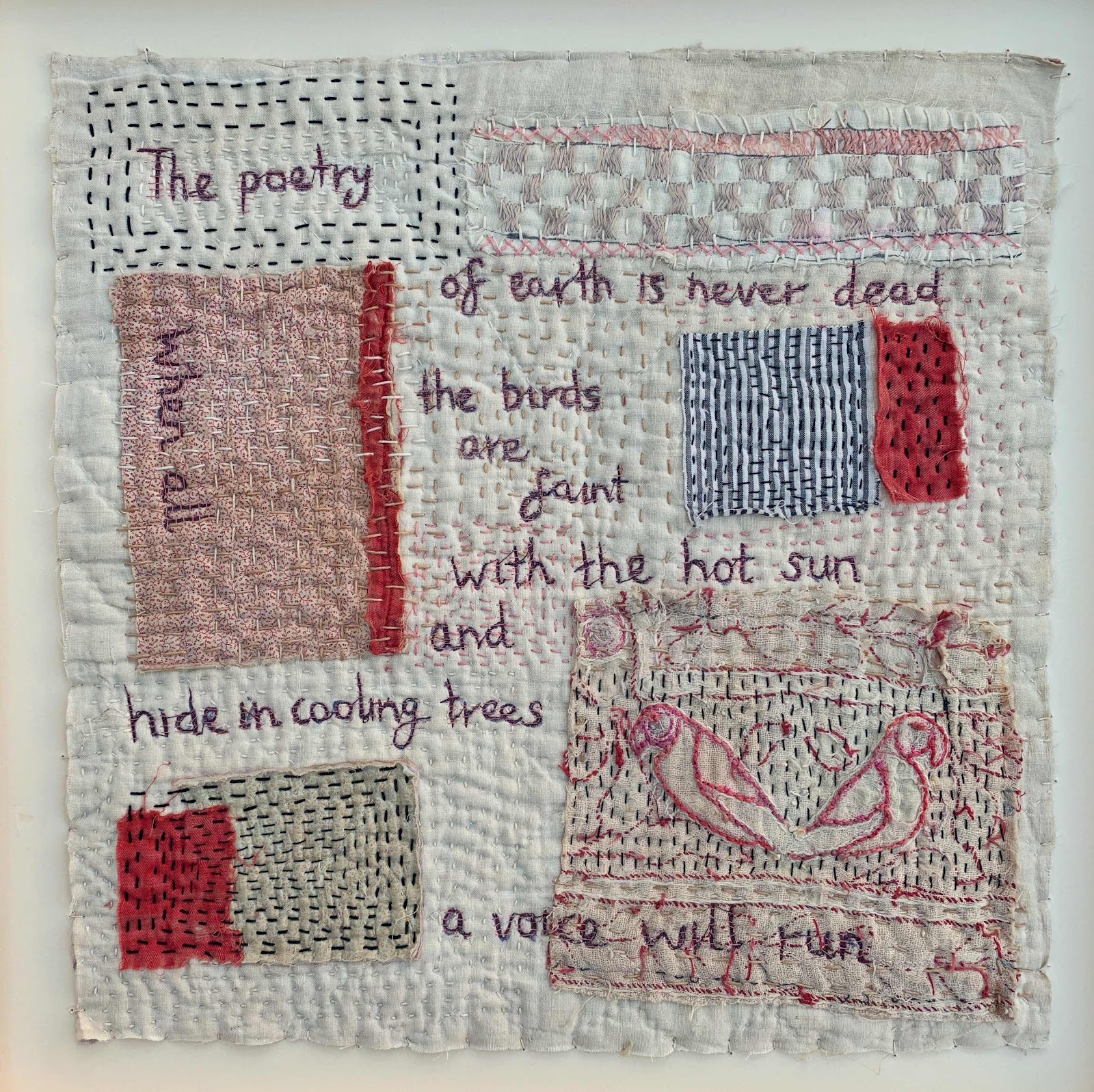 On the first picture shown, a couple of lines from the poem by John Keats "On the grasshopper and cricket", are free machined stitched onto the background.